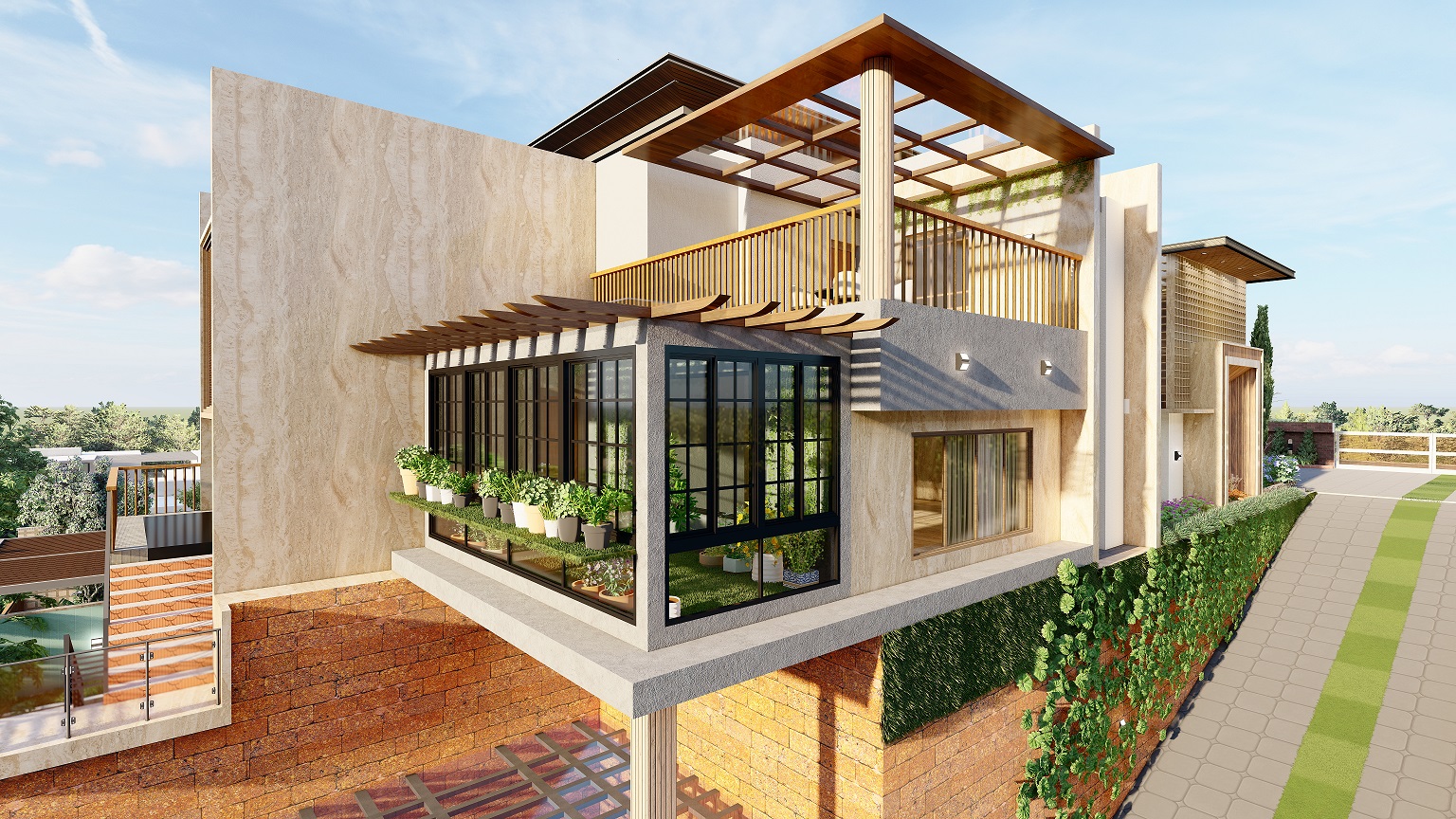 The Silvan Villa seamlessly blends modern architecture with traditional design. Featuring spacious layouts, unique roofing, and lush landscaping, it offers a perfect fusion of luxury, comfort, and sustainable living.